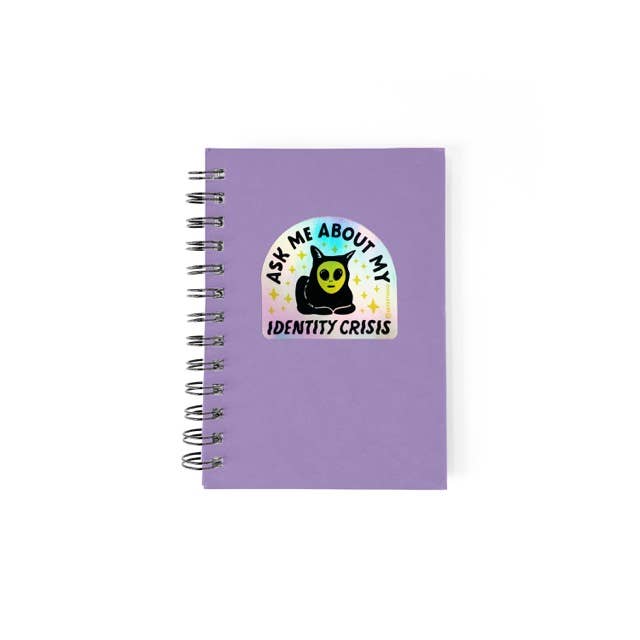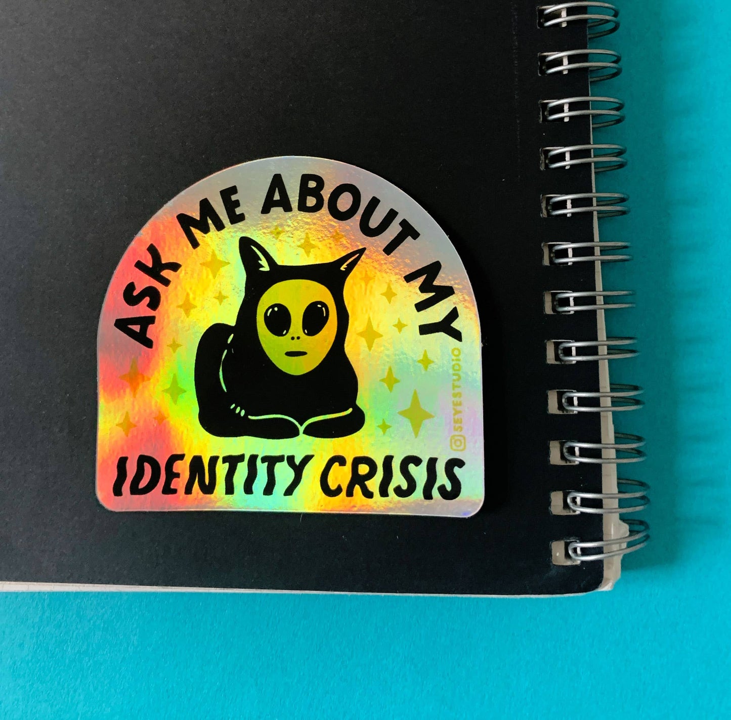 Ask me about my Identity Crisis Holographic vinyl sticker