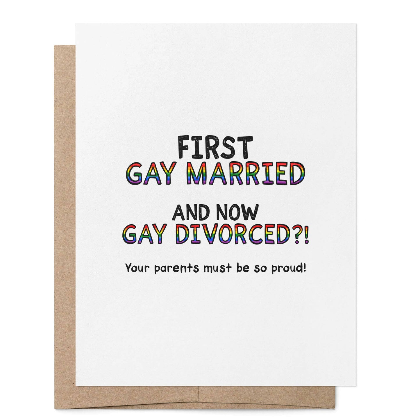 Is your friend divorcing their partner? Celebrate the occasion with this "First gay married, now gay divorced?! Your parents must be so proud" card.