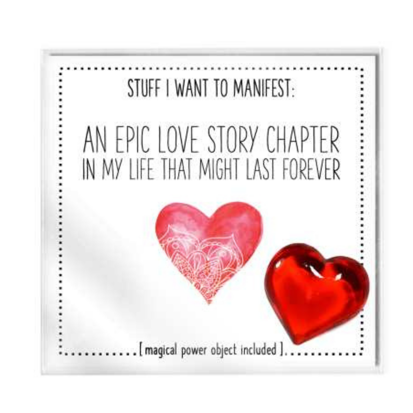 Each 3 x 3 package comes with a manifesting card and instructions on how to manifest, plus a super attractor Magical Power Object to carry with you or pin to your vision board to make it come true. You can keep it all together in the bag or carry the Magical Power Object in your purse or pocket separately!