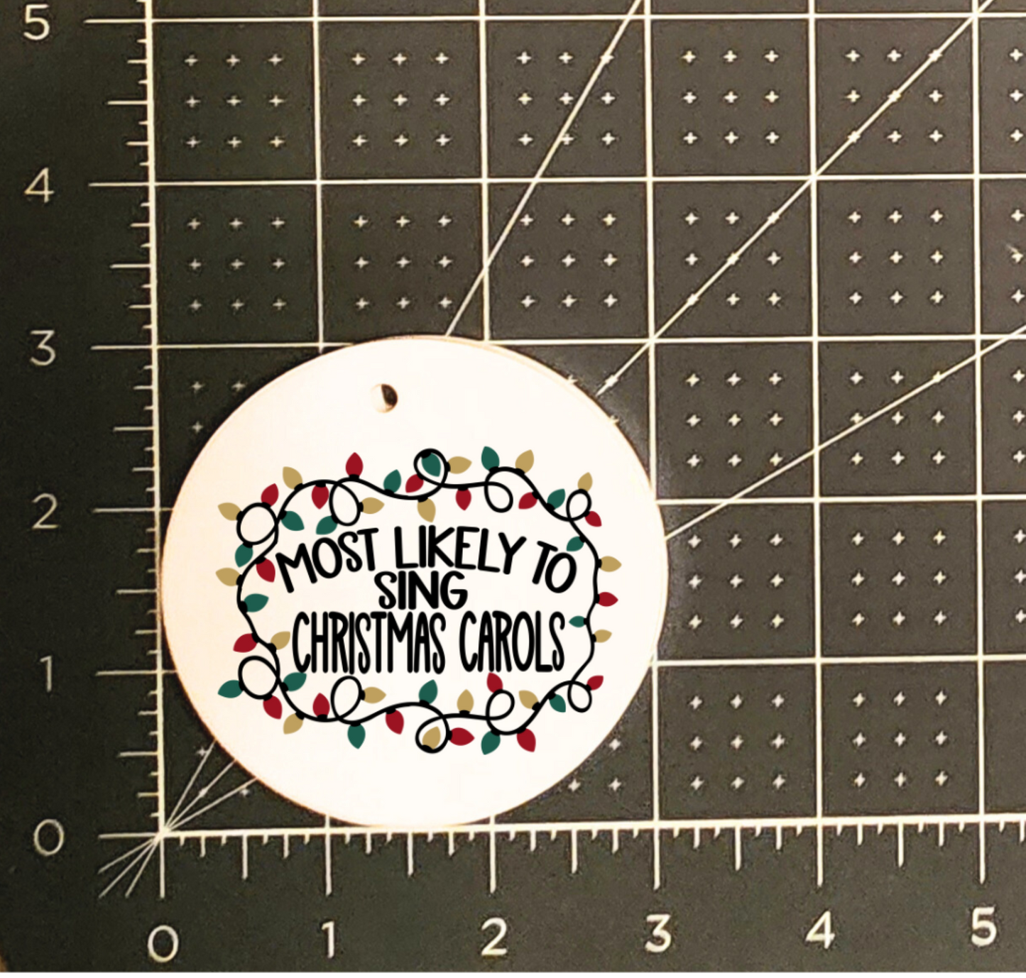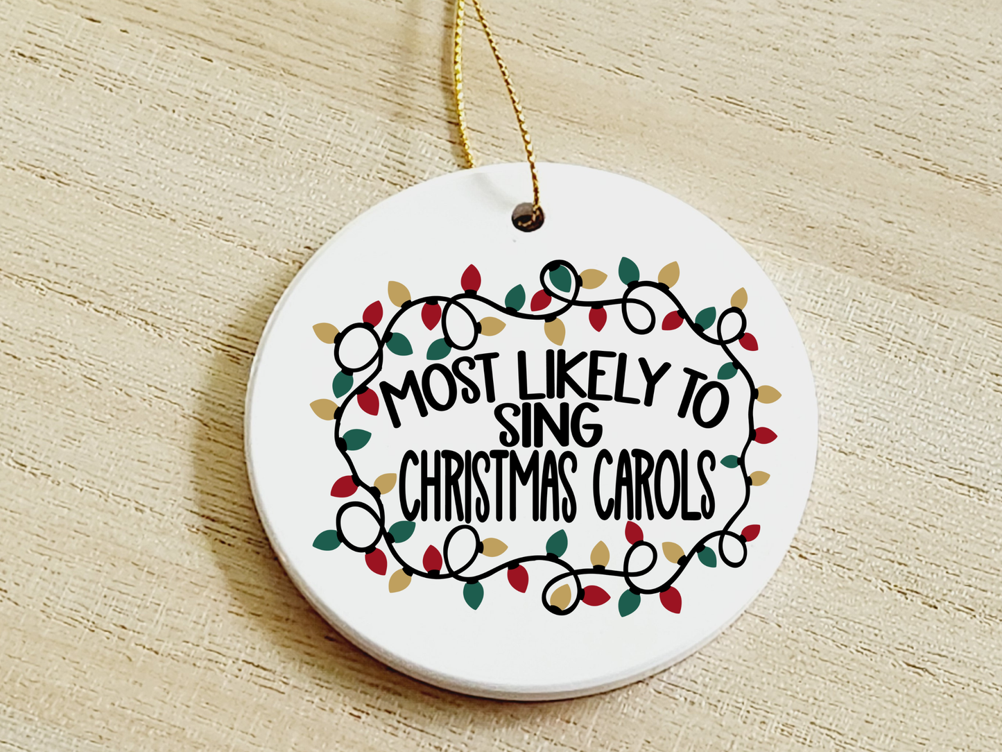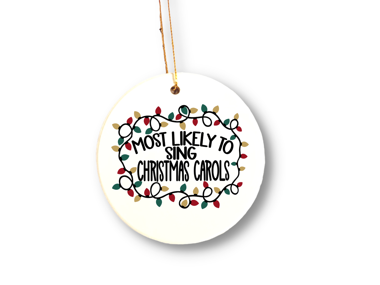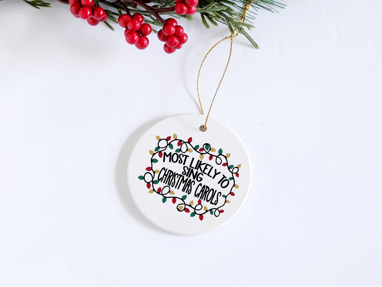 • Round ceramic ornament with a "most likely to" message that is a perfect fit for the holiday season.